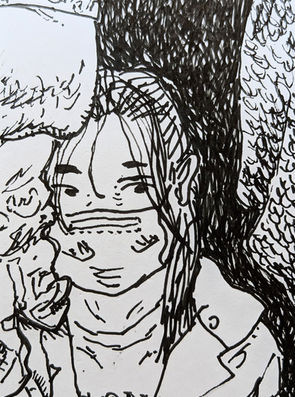 I draw from life on blank business cards while riding trains in Tokyo, Japan. I place the cards over my smartphone screen in order to remain anonymous while drawing. With my pen, I try to capture the ontological essence of my fellow crowded commuters, fitting their jumbled faces, bodies, clothes, and bags into too small a space. At the same time, chaotically scribbled negative space stands for the cosmic void.